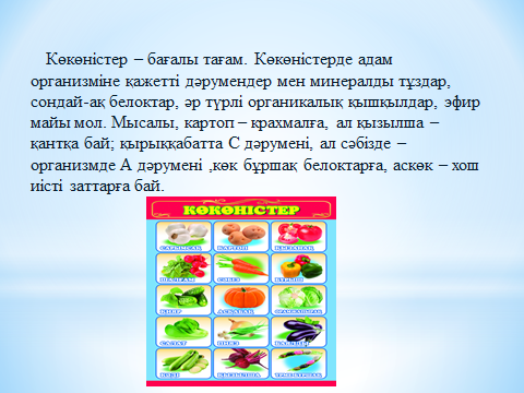 Дұрыс тамақтану – ұзақ және жемісті өмірдің негізі, денсаулықтың, сергектіктің кепілі, түрлі дерттердің пайда болуының кепілі. Сондықтан балабақшаның жұмыс жоспарында дұрыс тамақтану мәселесі маңызды орындардың бірін алады.